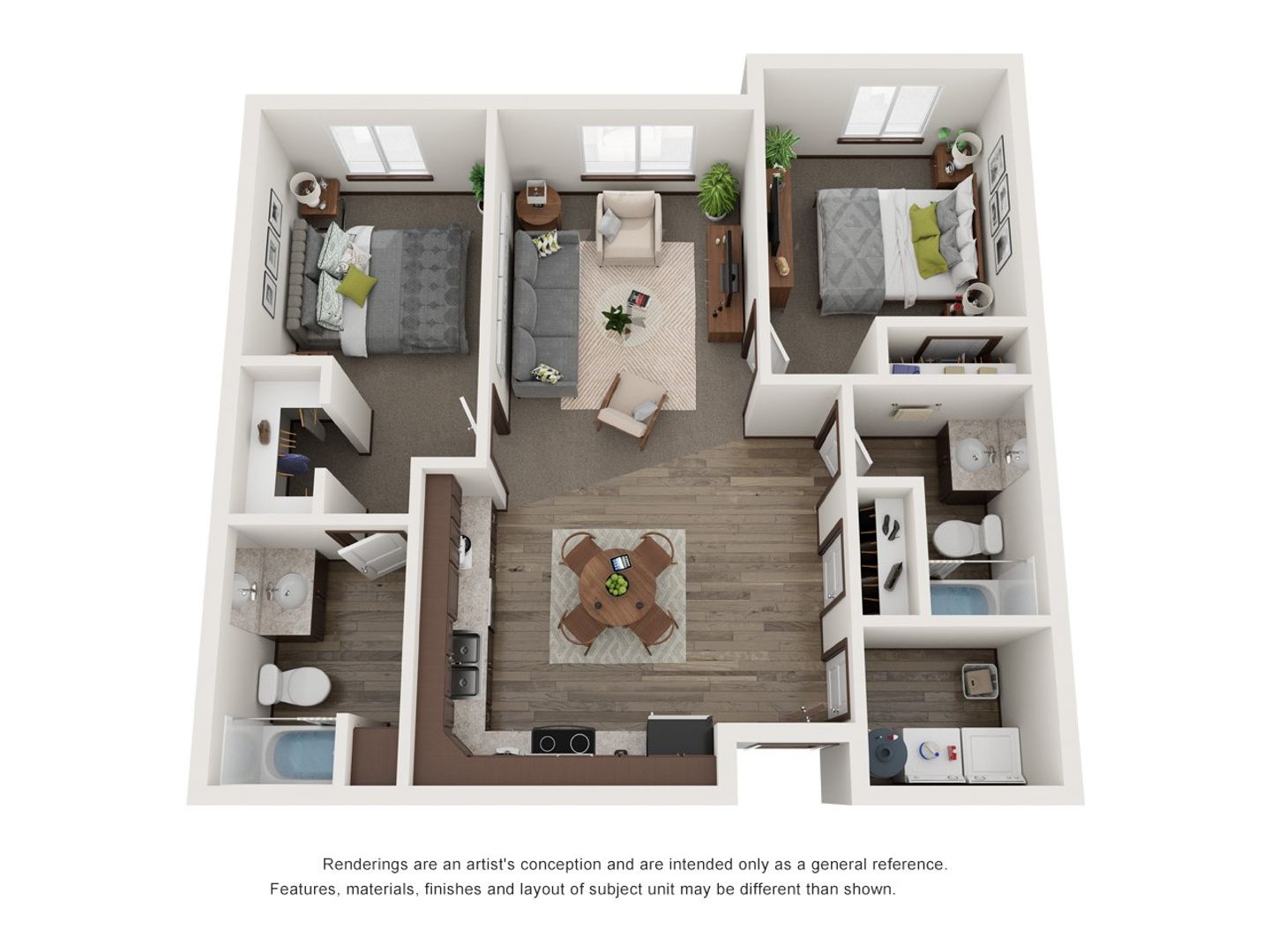 These unit spaces are unique compared to our other apartment layouts. The open floor plan is complemented with a generous kitchen, dining, walk-in laundry room, and living room spaces. The master bedroom has a sizable walk-in closet with a full adjacent bathroom.