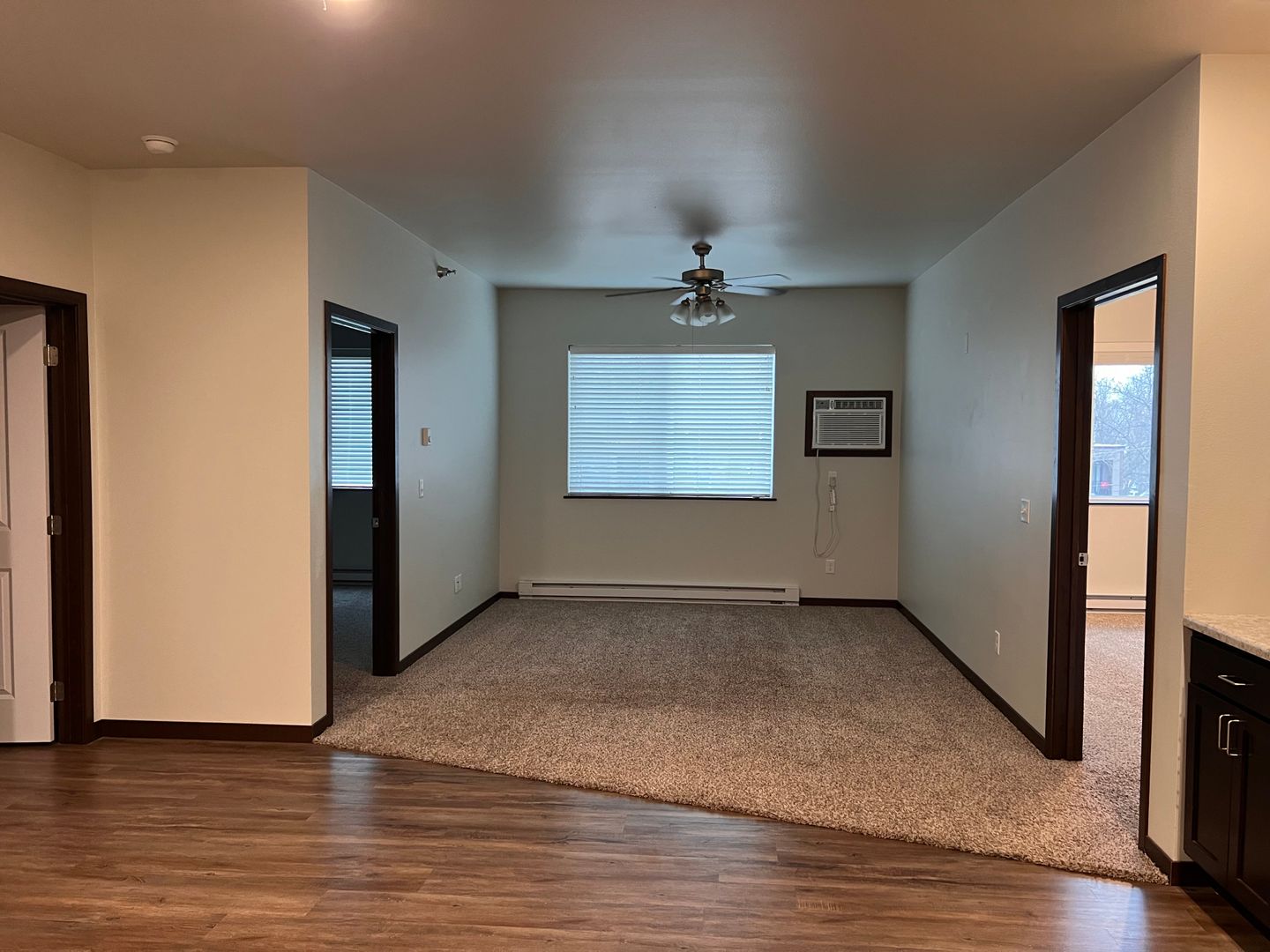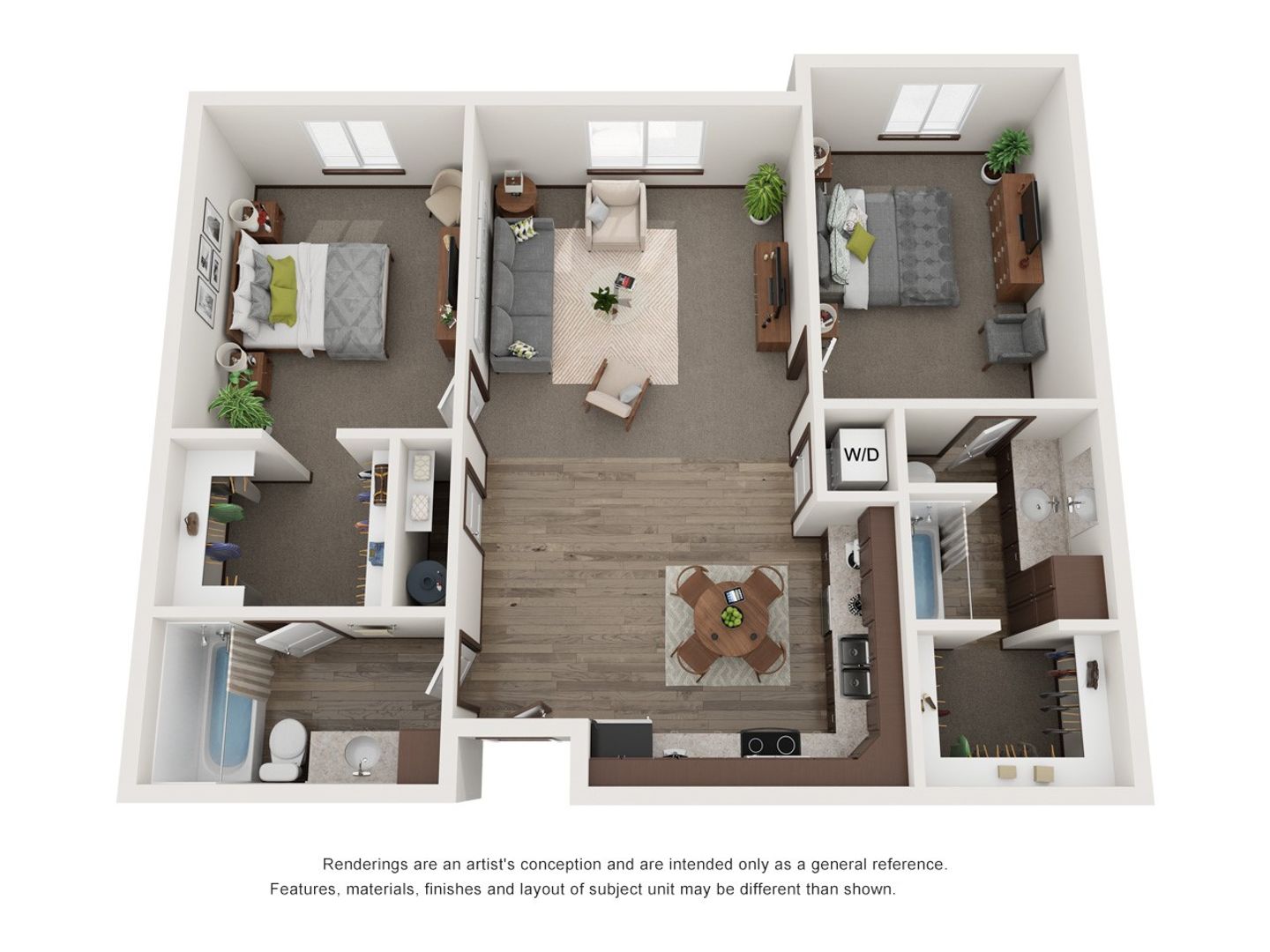 This is our most extensive apartment floor plan located in the corner of the complex. A true master suite open floor plan is complemented by a spacious kitchen, dining, and living space. Both bedrooms feature spacious walk-in closets, ceiling fans, and full adjacent bathrooms.
