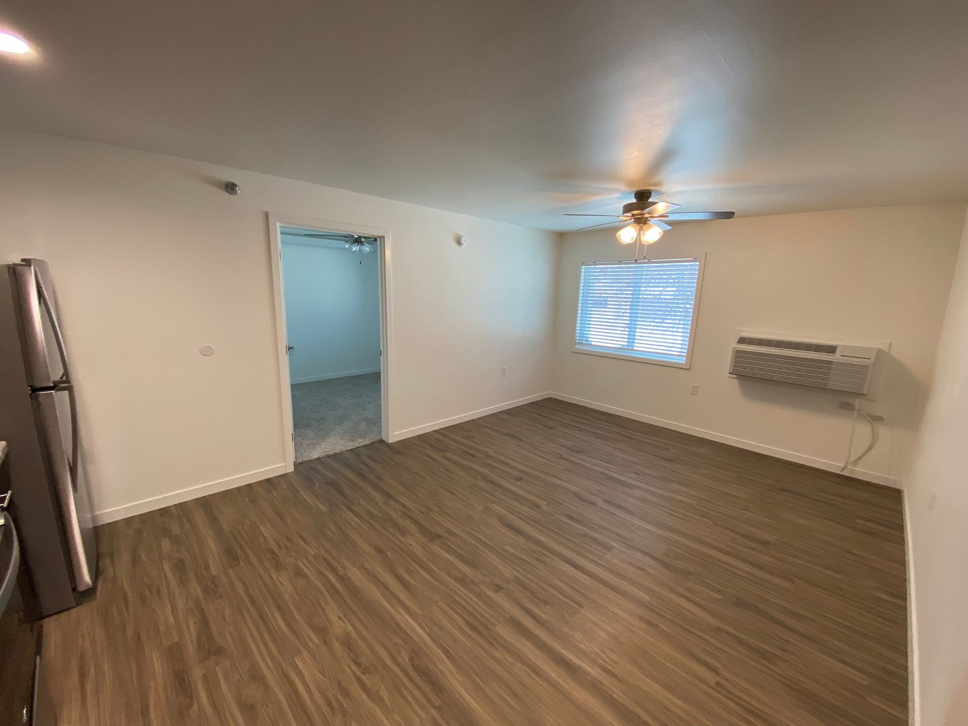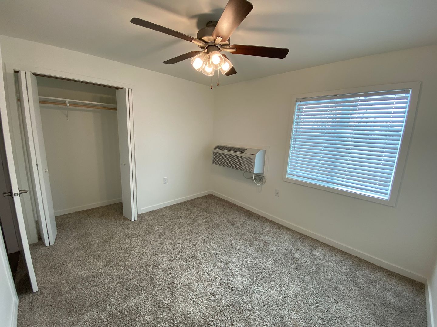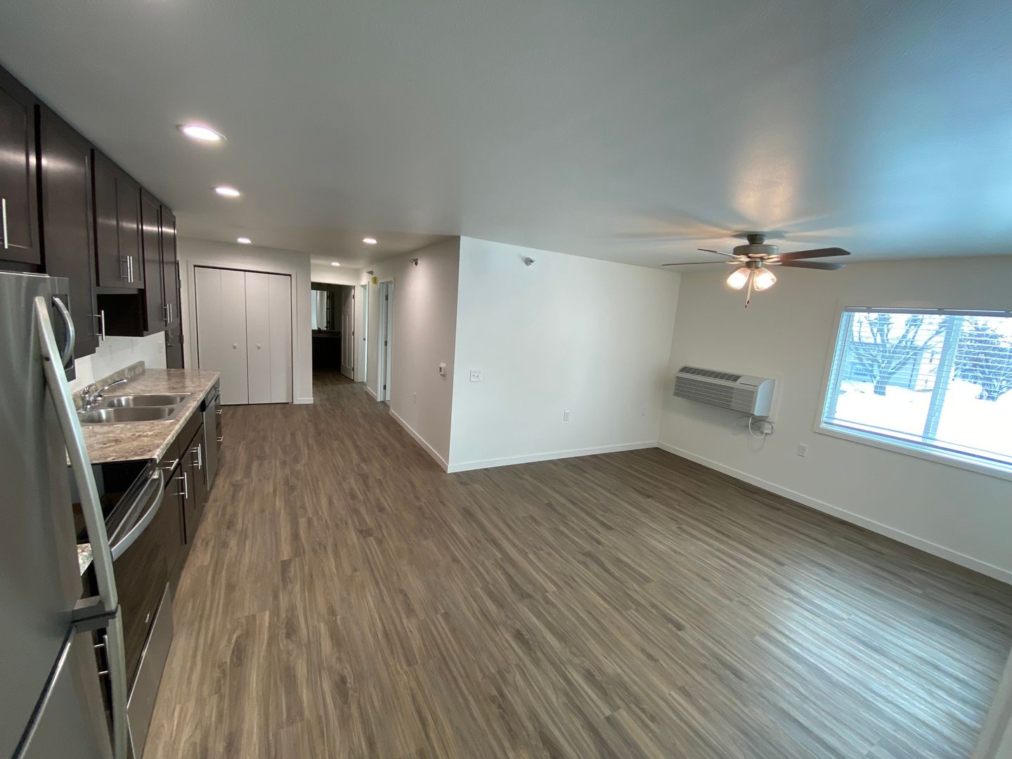 This two-bedroom, one bath unit at Leewood Apartments features an open living and kitchen area, full bathroom, and in-unit laundry. There is also zoned heating and cooling with dual climate-controlled units located throughout the apartment in bedrooms and living areas.