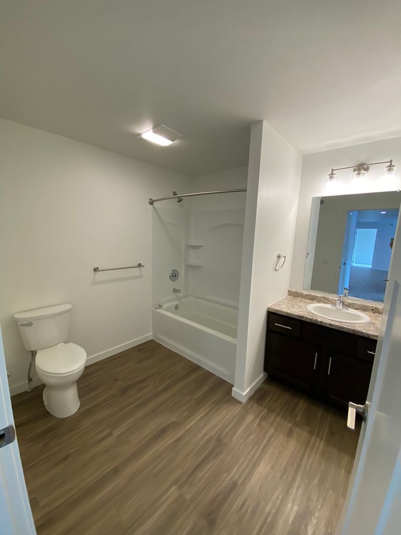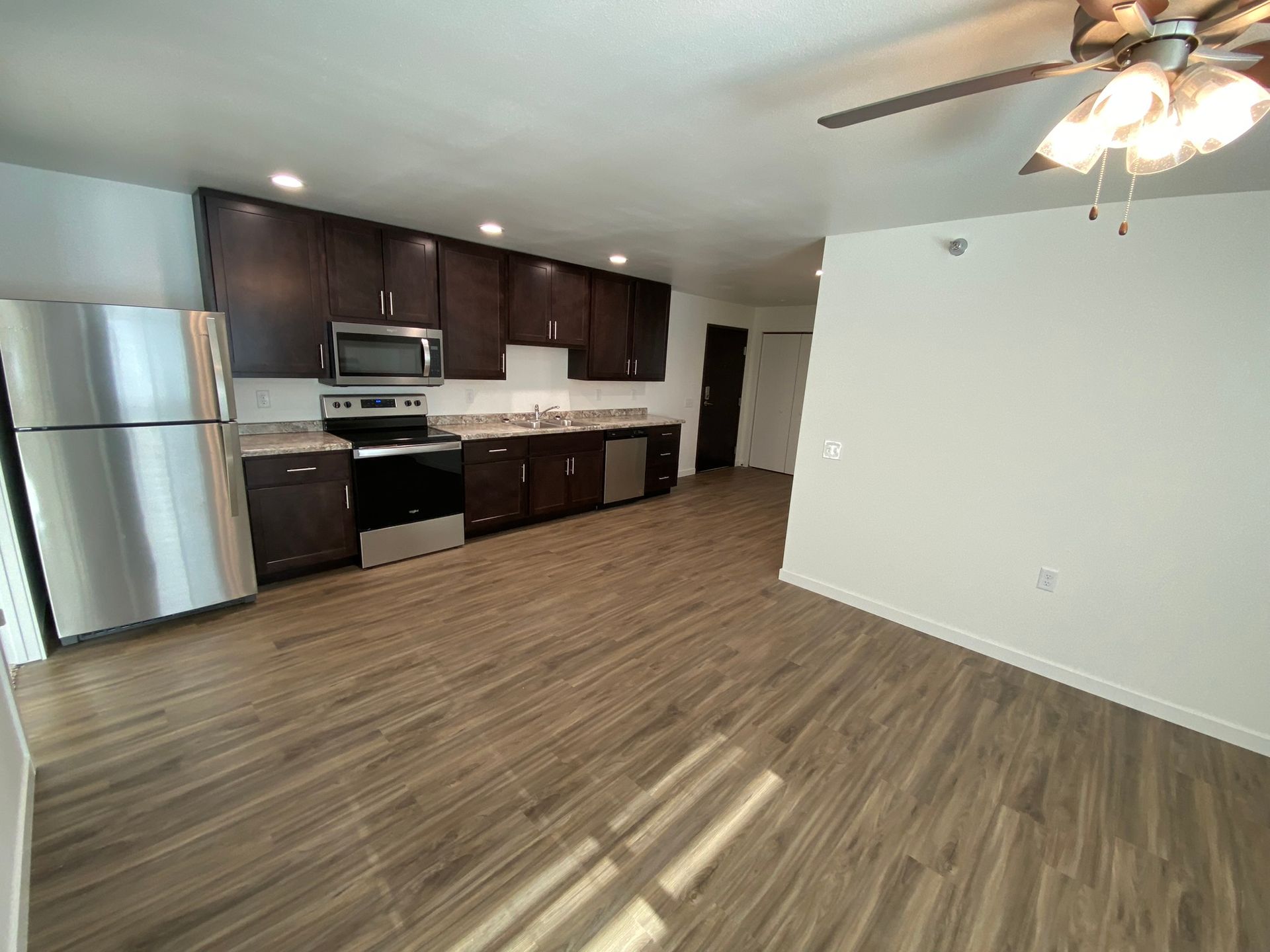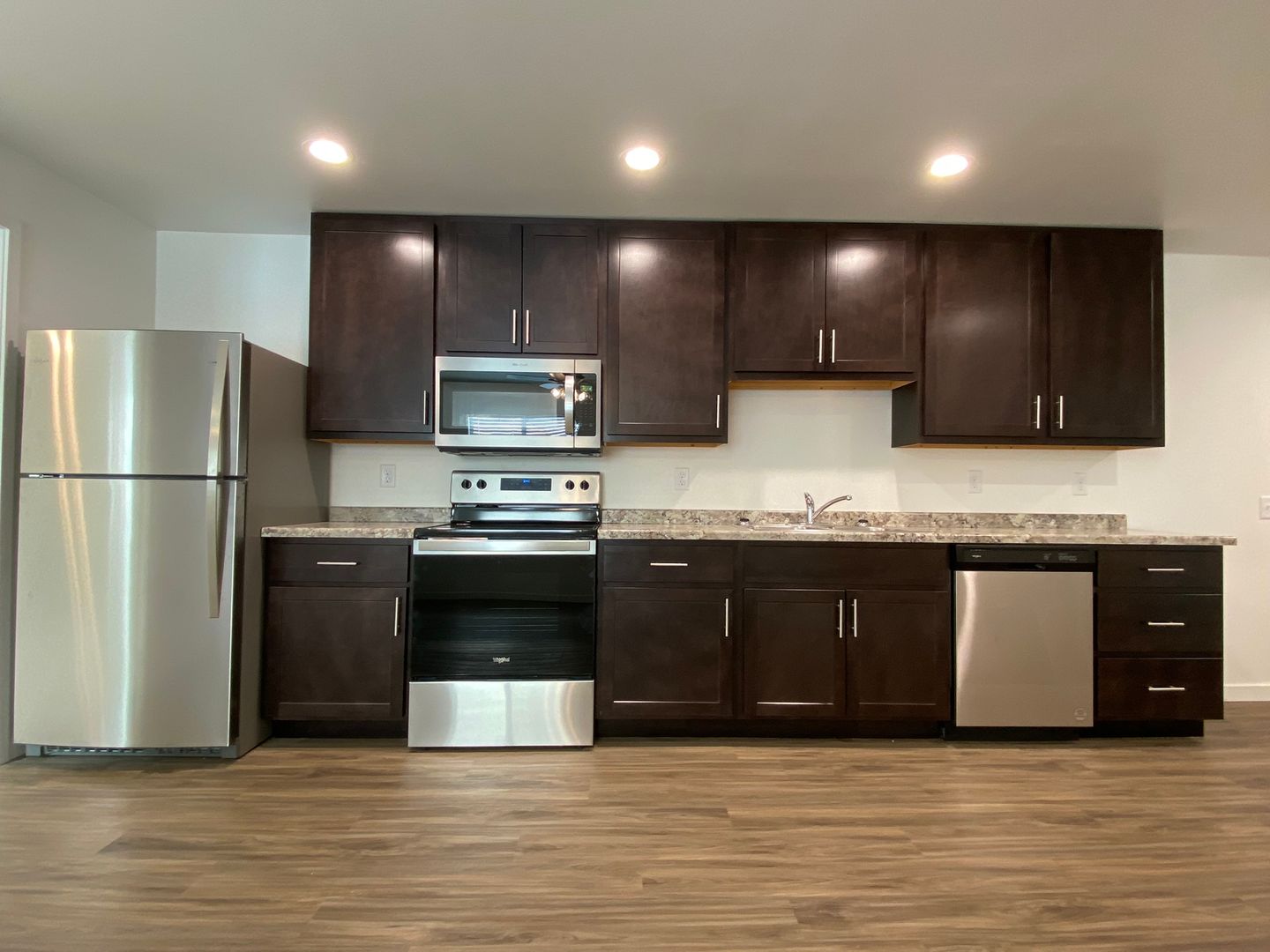 This two-bedroom, one bath unit at Leewood Apartments features an open living and kitchen area, full bathroom, and in-unit laundry. There is also zoned heating and cooling with dual climate-controlled units located throughout the apartment in bedrooms and living areas.